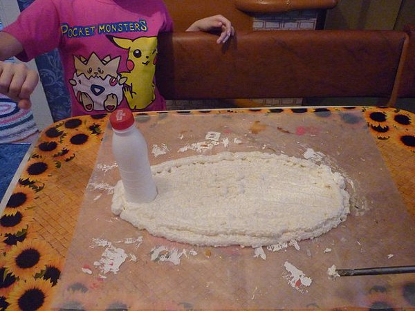 - Спачатку проста наносім пласт пены, які мяркуецца, будзе мець абрысы цела слімака. Далей наносім другі пласт і ўсталёўваны бутэльку. Яна стане шыяй скульптуры.